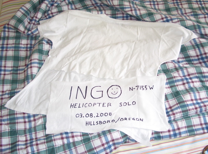 Als ich dann nach Hause kam und Michael, einer meiner Mitbewohner zurückkam, sollte eines meiner T-Shirts als Beweis- und Erinnerungsstück herhalten. Mit Küchenschere und Edding-Stift rückte er ihm zu Leibe und so bin ich nun offiziell fliegergetauft.