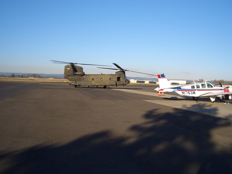 Während unserer Theoriestunde wurden wir durch lautes Getöse auf dem Flugfeld etwas abgelenkt. Auch die anderen strömten hinaus um die Ankunft der Mutter aller Helis zu sehen. Eine CH-47 Chinook landete und gab uns die Ehre genau vor unserem Hangar zu parken. Das ist doch eine etwas andere Kategorie von Hubschrauber als unsere kleinen R-22 Robbies. Natürlich kam sie mir nicht davon ohne abgelichtet zu werden.