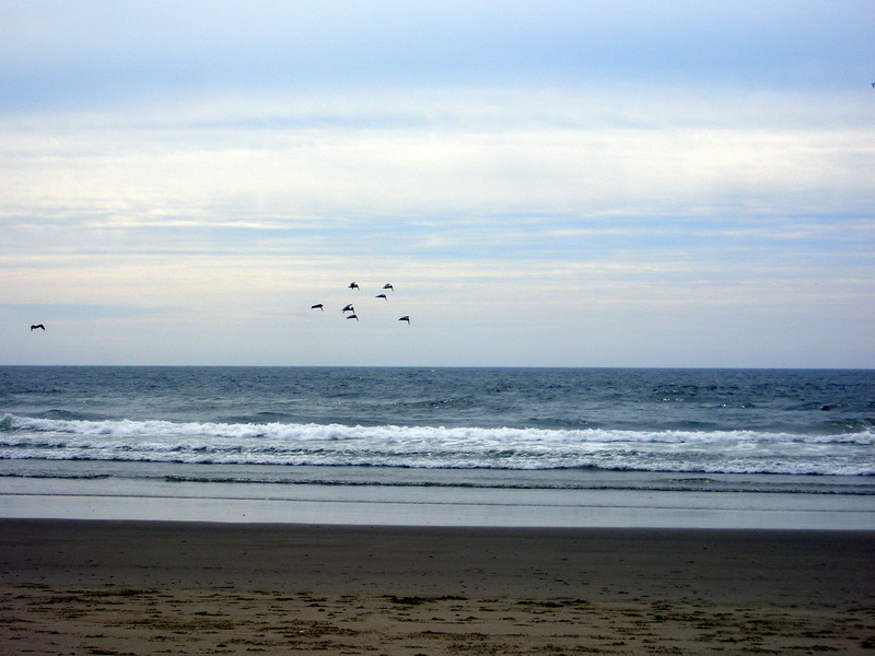 Wir genossen den Strand, die Brandung, die Sonne und die Pelikane, die uns ein tolles Schauspiel darboten. Wir testeten die Wassertemperatur und beschlossen einstimmig, daß es viel zu kalt ist. Doch Andre wagte sich dann doch noch hinein.
