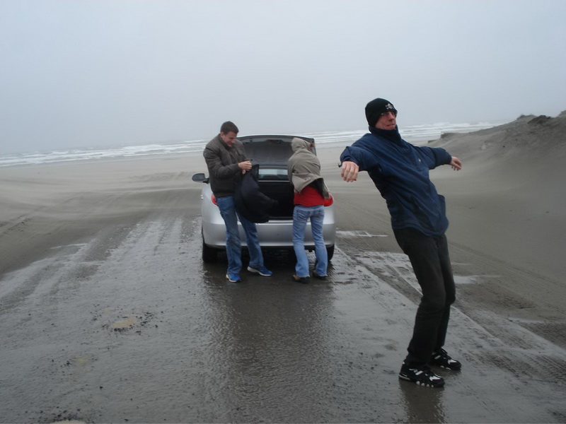 Am Sonntag stieg noch Alexander mit ins Auto. Wir fuhren stromabwärts über Scappoose und Kelso nach Astoria. Diesmal hatten wir richtig schlechtes Wetter und als wir bei Astoria kurz an den Strand gingen dauerte es nur wenige Minuten bis wir sandgestrahlt und durchnäßt waren. Bei Windstärken um die 30 Knoten (ca. 50 km/h) sprangen wir schnell wieder ins Auto und fuhren über Tillamook wieder nach Hause. Natürlich nicht ohne uns zwischendurch einen heißen Kaffee und ein Stück Kuchen in einem schönen, kleinen Cafe zu gönnen.